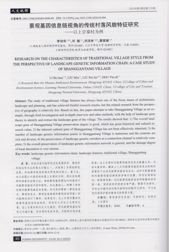 李伯华教授科研团队《景观基因信息链视角的传统村落风貌特征研究——以上甘棠村为例》以中国传统村落上甘棠村为例,通过实地调研和深度访谈等方法,借助景观基因理论对村落进行风貌景观基因识别和提取,构建了传统村落风貌景观基因信息链,并对其四要素(景观信息元、景观信息点、景观信息廊道和景观信息网络)的风貌特征进行了解析。