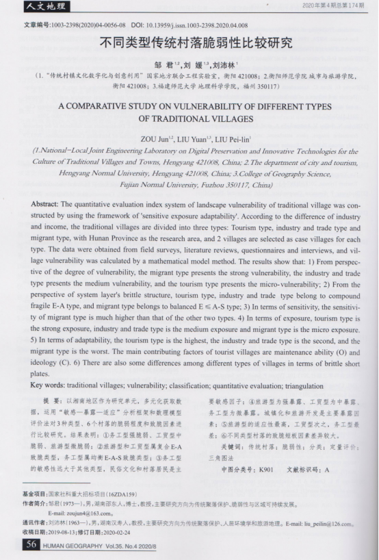 1.《不同类型传统村落脆弱性比较研究》:https://kns.cnki.net/kcms/detail/detail.aspx?dbcode=CJFD&dbname=CJFDAUTO&filename=RWDL202004009&v=MTUwMjZZUzdEaDFUM3FUcldNMUZyQ1VSN3FmYnVSdUZ5N25WcnJQTnpyUFlyRzRITkhNcTQ5RmJZUjhlWDFMdXg