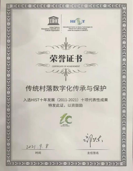 9月8日,联合国教科文组织国际自然与文化遗产空间技术中心(简称HIST)成立十周年学术年会在北京召开,会议发布了十年来创造的十大代表性成果,团队的成果“传统村落数字化传承与保护项目”被列其中。