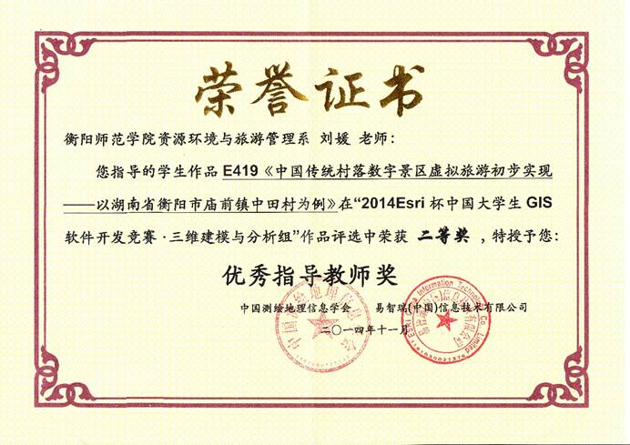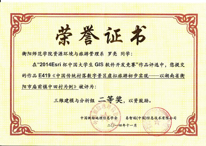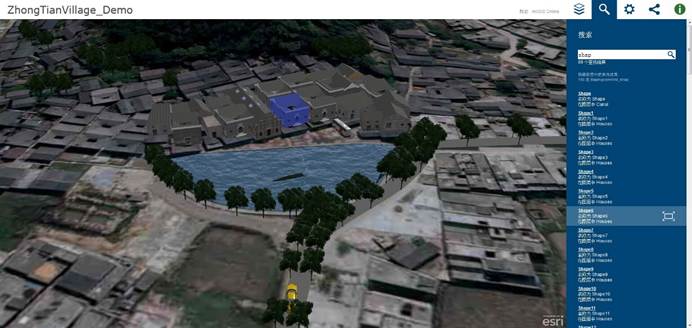 湖南省衡阳市中田村地处东经112°07’、北纬26°07’。该村内最具有代表性的古建筑群始建于明末清初,迄今600多年,虽经历数百年的风雨剥蚀,目前仍保留了从康熙48年到民国的旧宅100多幢,天井200多个,巷道108条,有民宅、祠堂、商铺等,整体建筑面积达18000多平方米。民居既有江南民居的建筑特色,又有独特的本土建筑风格,是湖南省目前保存较完好、规模较大的明清古建筑之一。该项目基于Web平台,学生通过分析古建筑的特征,借助GIS的CityEngine软件进行规则建模、交互建模、纹理映射法构建的综合批量建模。初次将使用于城市建模的软件应用到乡村复杂的古建中。不仅能体现出精美的现状还原,还能实时同步监控破损情况,为政府部门提供更为直观的网络浏览、查看以及后续开展旅游成本计算、开发的决策依据。该项目荣获2014Esri杯中国大学生GIS软件开发竞赛•三维建模与分析组二等奖。